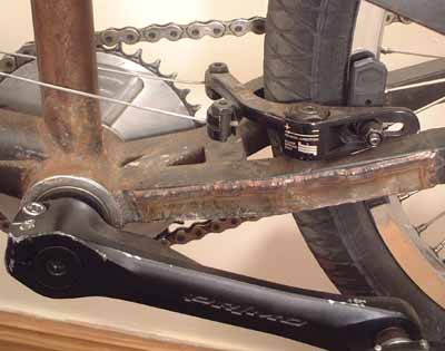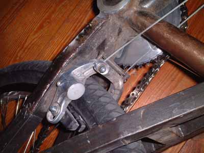 This view shows my old rear brake. This was a modified U'brake that I ran for about 3 years. The pivots were bored out and sleeves glued in which take 2 sealed cartridge bearings each. The springs had to come out to make room for this and I replaced them with a single tension spring accross the top of the arms. This was a bit of a bodged job and is coming to bits now but it has worked very well and has needed absolutely no maintenance over its life. The exrtra long straddle is a piece of mountain bike braided inner cable held in the pinch bolt and with a nipple clamp (see catalogue). |