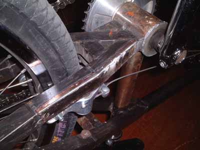 If you have ever lost a peg during a grind you will know that it laces your chainstays when they hit the edge. This thin bit of stainless welded to my chainstays has taken a lot of hits and done an excellent job of protecting the even thinner T45 beneath. In this picture you can also see the Modified BSD sprocket that I ran. These are seriously good, made by BSD in Glasgow and 10mm thick. You can also see the old position of the brake mounts under the seatstays. I had to shift them from there after I built it because they hit the chain.... | ![]() |