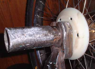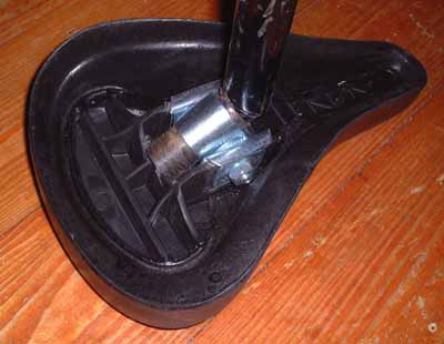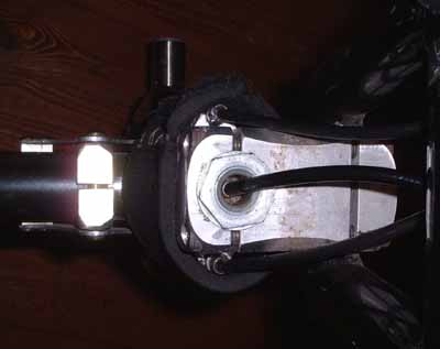 the big loop of cable and it weighs less. This is totally the way to go if you like simplicity, the outer cable housing stops at the fork top bolt and the inner just runs down the steerer and out through an angled hole. Although you would expect this to be a nightmare to set up it is actually dead easy. The brake blocks are held on with nuggets (see catalogue). I always bung a jubilee clip (hose clamp) round the headset cup BEFORE it breaks. |