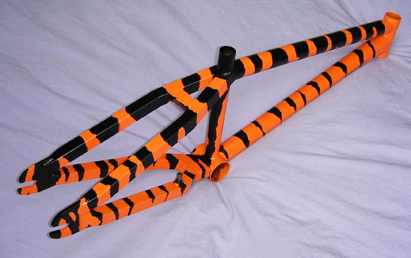 OK this is my previous bike set-up. As you can see it is pretty much all custom stuff. I grind on the left and just run two left pegs (which are on the other side here). The whole thing weighs just under 33.5lbs at the moment which isnt bad. The frame is TIG welded from T45, the chainstays are box section aerospace certified and the rest is round commercial grade stuff. I have been riding this frame for about 4 years now and as you can see it is holding up pretty well. The back end is set at 14.25" and the top tube is about 20.5". I run a 36-13 gearing.
