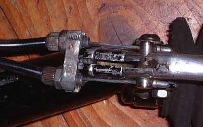 Running two top gyro cables is always the way to go but can be tricky. My old solution was to drill the lever through and clamp two ordinary cables in a slightly modified pair of nipple clamps (see catalogue). What I did was to set the cables to the right length then clamp a nipple clamp to each one. The nipple clamps had had the hexaganol heads sawn off. When they were tight I inserted another grub-screw into one of the nipple clamps so it stuck out the top then screwed the two clamps together with it. Then I inserted the barrel adjusters into the home-made little doubler plate. While I was at it I reamed out the levers and fitted some more sealed cartridge bearings... |