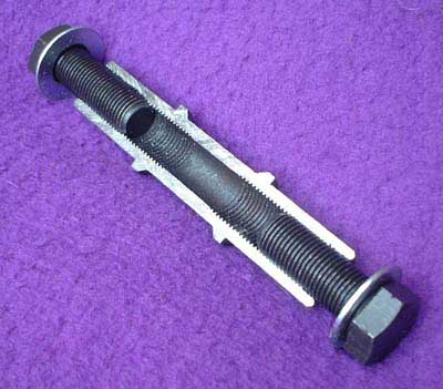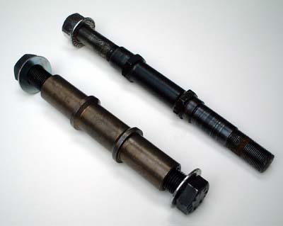 no need to enlarge the dropout or anything. Again we have cut this axle right down the middle so you can see just how efficient and simple it is. You can also see just how much thread engages on the bolts. Because there is typically 2 to 3 times as much thread engaging as on an ordinary wheel nut the bolts can be cranked down as tight as you want without any risk of stripping. This means that the wheel is not going to slip in the dropout and chain tensioners are not necessary (saving weight and removing one of the most vulnerable components). Because the bolts are an "off-the-shelf" size they can be purchased in a whole range of lengths from any good bolt stockists, so you can tailor them to your own set-up. |