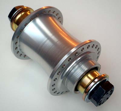 everything. The first thing you will notice is that there are no cone nuts. Instead a simple precision made collar slides over the end of the axle and is clamped in place when the main axle bolts tighten the dropout of the bike against it. Because of this system you will NEVER have to adjust anything on a G-Sport hub, just fit and forget. From this view you can also clearly see how the massive bearings have had to be mounted in-board of the freewheel. All other freewheel hubs squeeze tiny bearings into the gap between freewheel and axle with the result that they dont last very long. Although the hub looks big and chunky on the outside from the cut view you can see that the shell is actually almost entirely hollowed out keeping weight to a bare minimum while enhancing stiffness. The large surface area of the ends of the axle and collars, coupled with the super strong stiff 20mm axle, actually strengthens the bike! By bolting the two droputs together with such a stiff axle the overall strength of the whole bike is improved so much so that you can FEEL the difference. All G-Sport hubs feature angles flanges so that the spokes run straight to the rim with the minimum of distortion. |